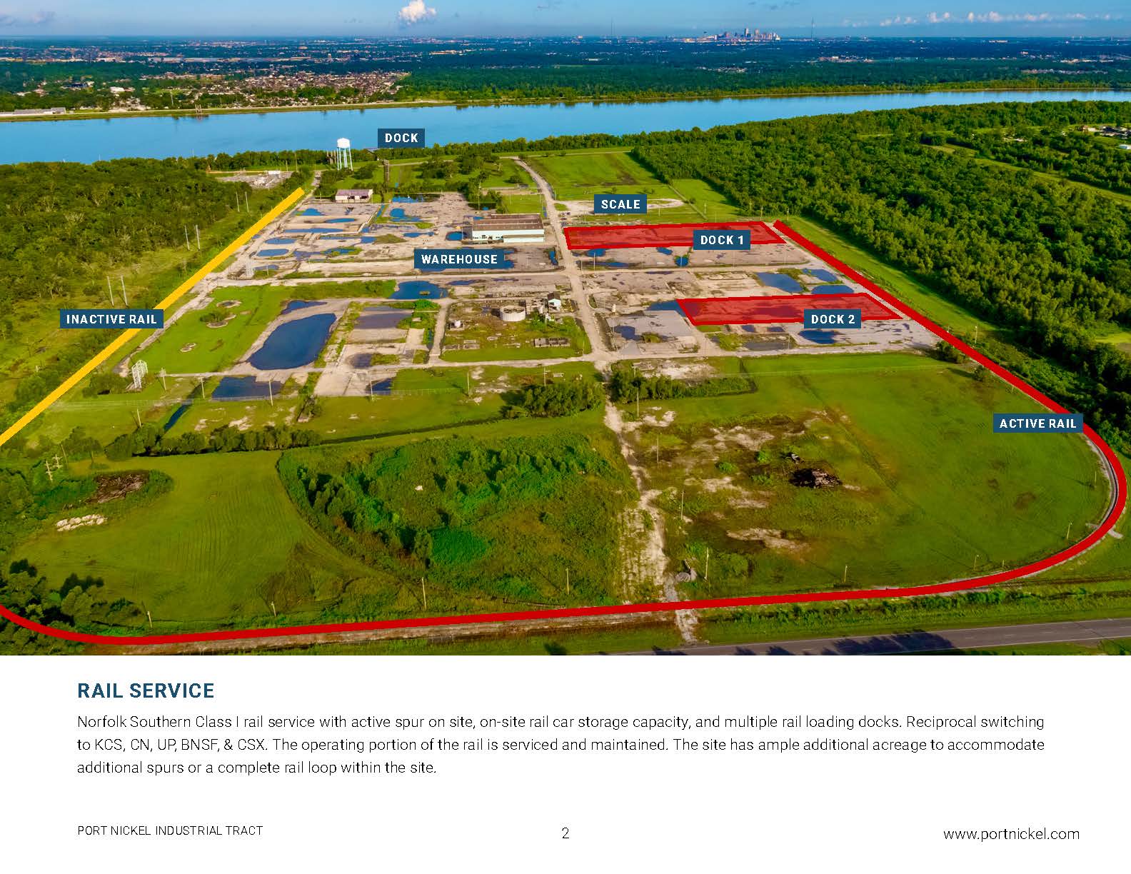 */- 387 acres of land fronting the levee protected Mississippi River. The property includes 510' X 52' dock with 774' +/- feet of dock mooring area and second inoperable former liquids dock in need of refurbishment. The property has Norfolk Southern Class I rail service with active spur on site, on site rail car storage capacity, and multiple rail loading docks. Reciprocal switching to KCS, CN, UP, BNSF, & CSX. Also included are .386,000 +/- square feet of pile supported laydown yard and only 45 +/- acres are considered wetland by 2014 United States Army Corps of Engineers Jurisdictional Determination. Buildings on the property include 66,763 +/- square foot warehouse and a truck scale.
